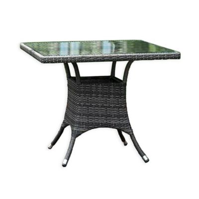 Background. Christopher knight home dining tables. 28 square, 5mm thick glass, 1.375 edge top, decorative black rattan edge band.